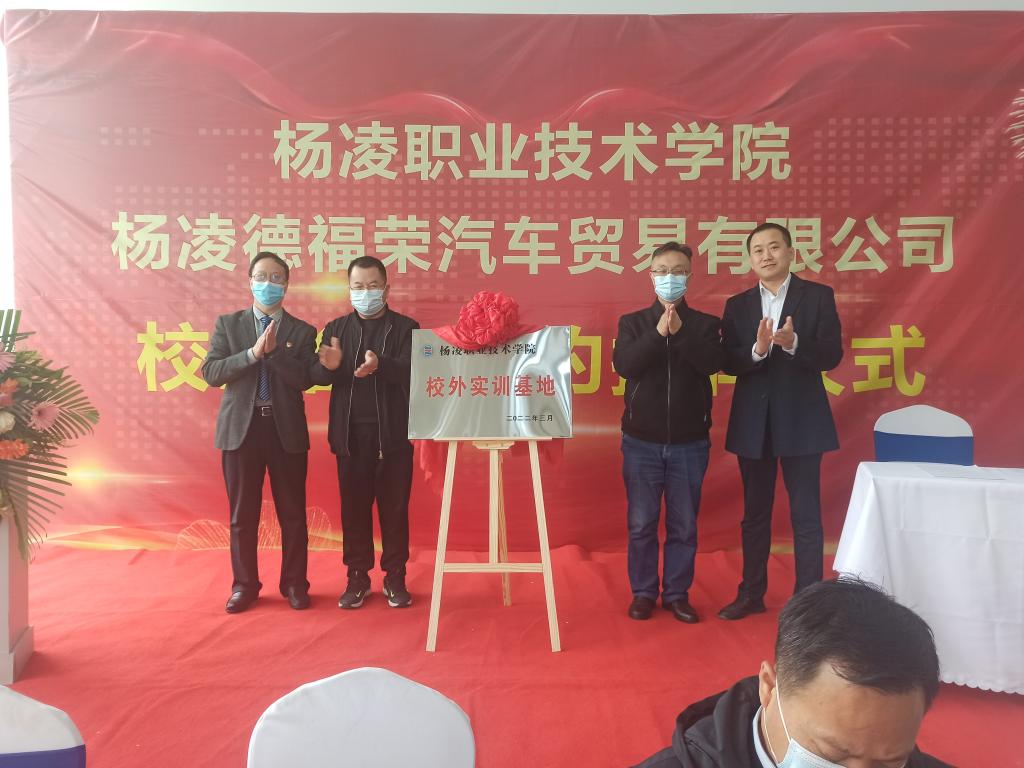 3月30日上午,我校机电工程学院与杨凌德福荣汽车贸易有限公司举行校企合作签约暨校外实训基地揭牌仪式。杨凌示范区工商联党组书记卓涛,杨陵区委常委、组织部部长王勇,杨陵区工商联党组书记李俊苗、工信局局长陈团江及李台街道党工委相关领导,我校机电工程学院党总支书记马秀魁、院长龙建明,杨凌德福荣汽车贸易有限公司法人穆斌、总经理穆涛等出席签约仪式。