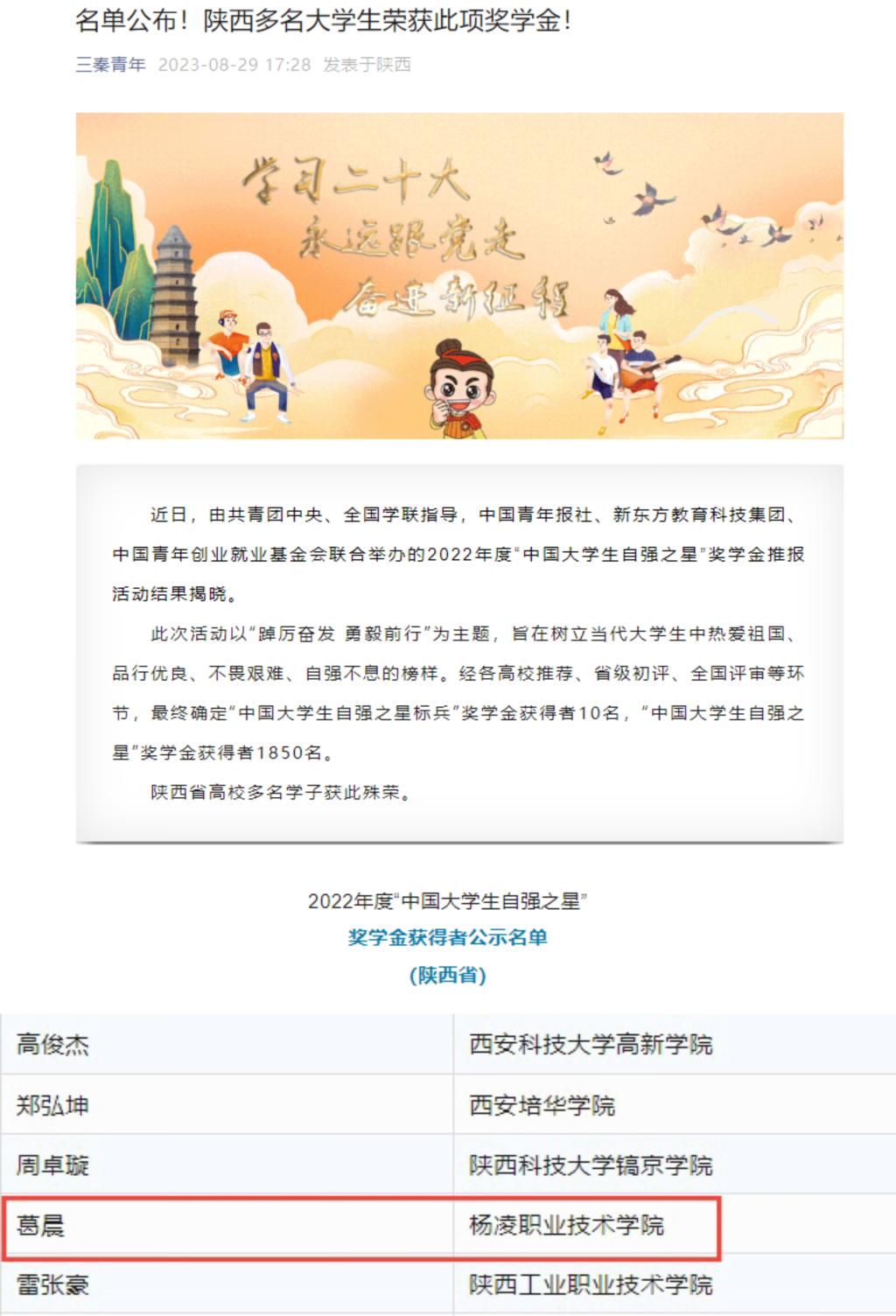 近日,由共青团中央、全国学联指导,中国青年报社、新东方教育科技集团、中国青年创业就业基金会联合举办的2022年度“中国大学生自强之星”奖学金推报活动结果揭晓我校水利工程学院学生葛晨荣获2022年度“中国大学生自强之星”称号。