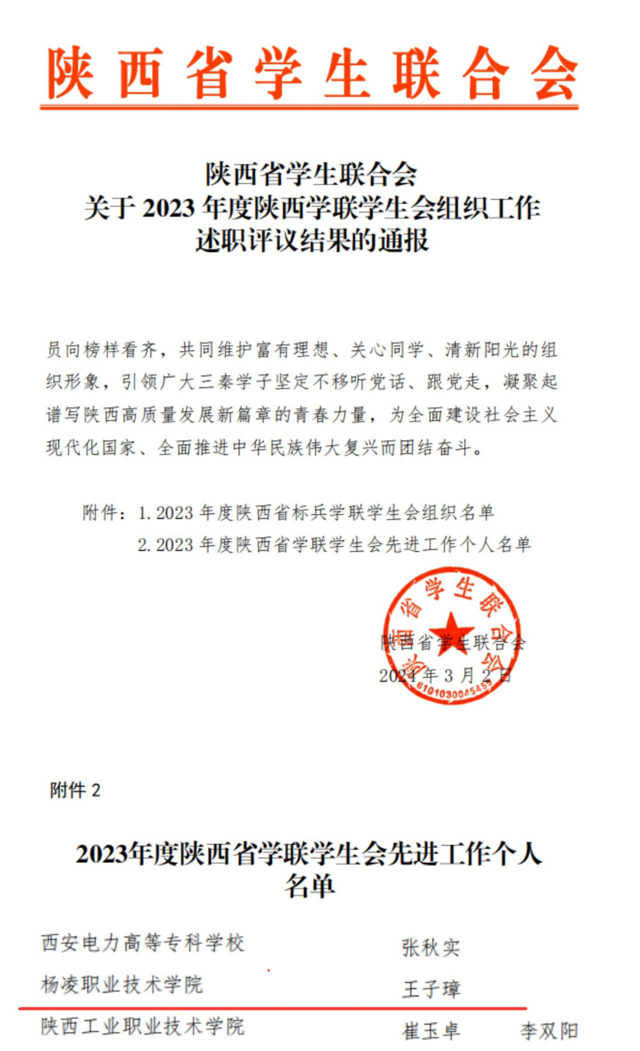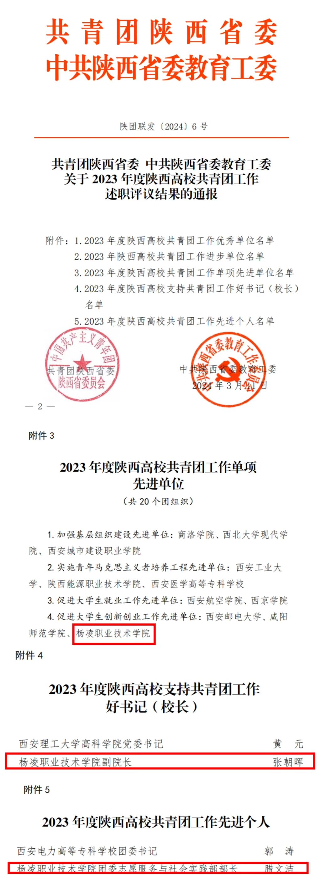 近日,团省委、省学联分别公布了2023年度陕西高校共青团工作和学生会工作考核结果,我校荣获2023年度陕西高校共青团促进大学生创新创业先进单位,副校长张朝晖获2023年度“陕西高校支持共青团工作好书记(校长)”荣誉称号,校团委腊文洁获2023年度“陕西高校共青团工作先进个人”荣誉称号。我校第六届学生会执行主席王子璋同学被评为陕西省学联学生会先进工作个人。
