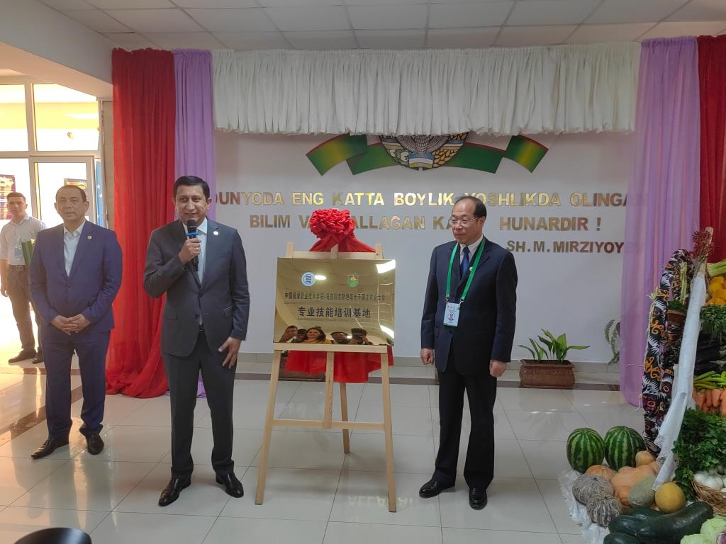 在乌兹别克斯坦塔什干国立农业大学,仲伟周参观了该校现代农业科研成果展,为“中国杨凌职业技术学院-乌兹别克斯坦塔什干国立农业大学专业技能培训基地”揭牌。双方围绕教育交流合作内容进行了深入讨论,并达成共识。