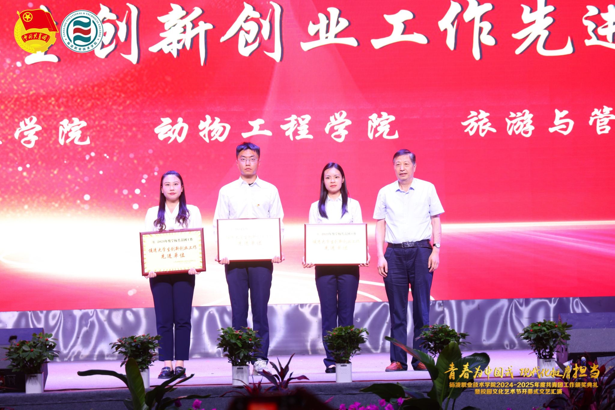 在颁奖典礼上,副校长张朝晖致辞全校青年团员,希望大家胸怀凌云之志,锻造过硬本领,做挺膺担当的奋斗者。典礼宣读了《共青团杨凌职业技术学院委员会关于表彰2024-2025学年度先进集体及先进个人的决定》,学校领导为五四红旗团委、五四红旗团支部、优秀共青团干部、优秀共青团员等先进集体和个人颁发奖章。