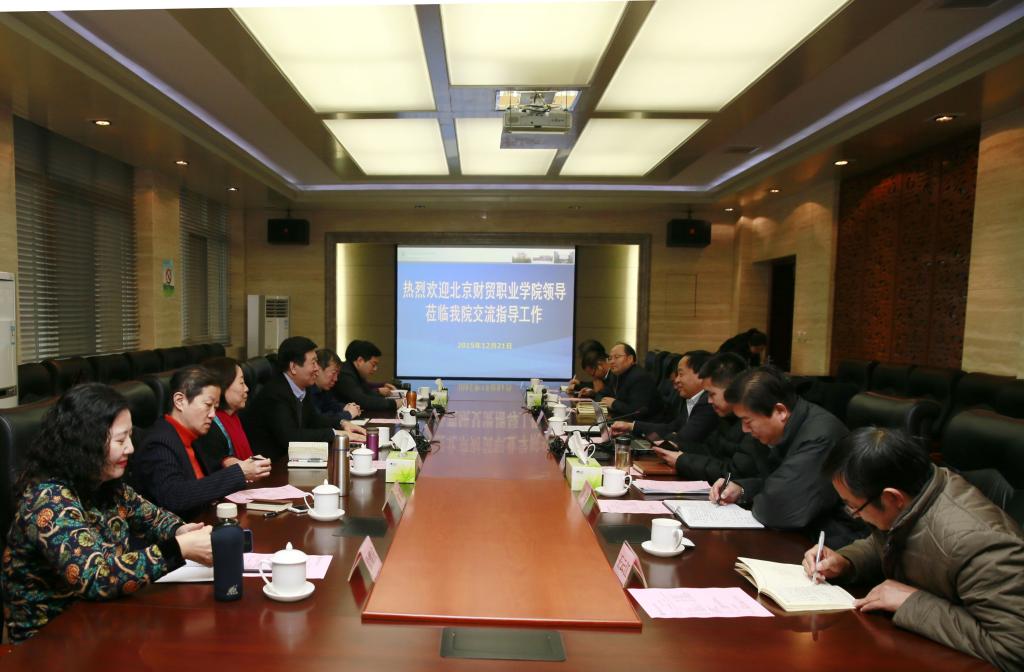 12 21 上午,北京财贸职业学院院长王成荣一行7人来我院参观访问。上午900,座谈会在醒钟楼A208会议室举行。院长王周锁、党政办公室、人事教师处、教务处、招生就业处、纪检监察审计处、旅游与管理分院、思想政治理论课教学部等部门主要负责人出席座谈会。