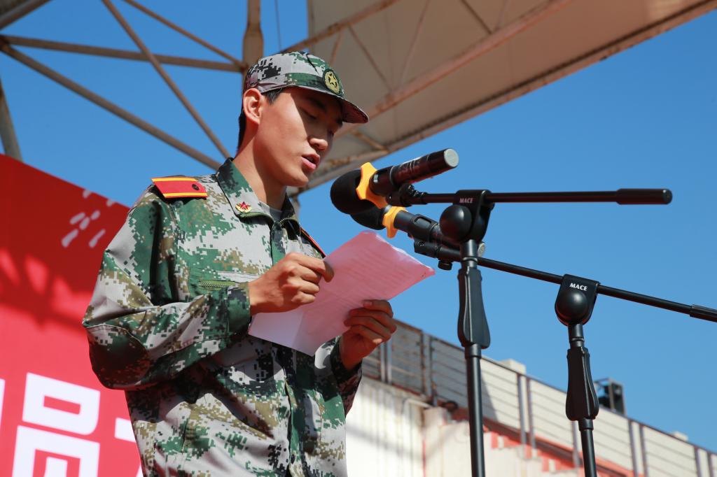 学典礼暨军训动员大会上,经济与贸易分院教师郑伟生态环境工程分院2017级新生石健阳分别作了发言,中国人民解放军68302部队、本次军训团团长马防作了动员讲话。