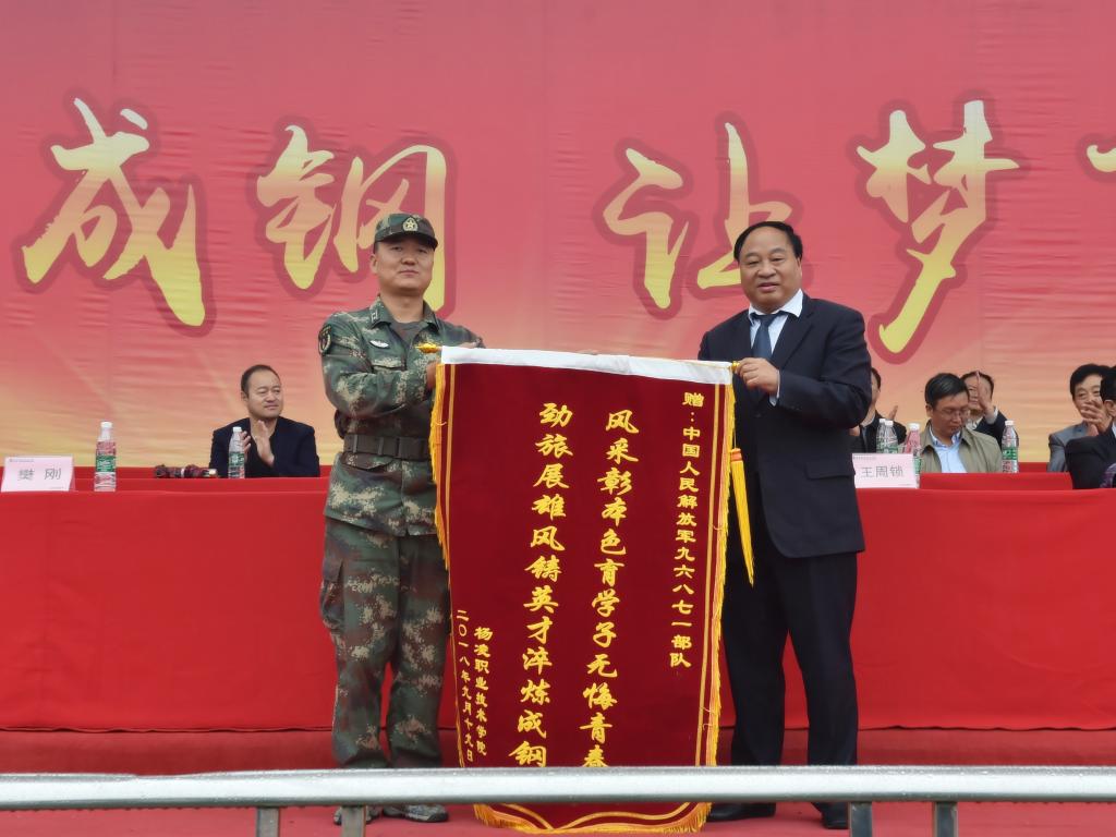 党委副书记、院长王周锁代表学院向军训部队赠送锦旗
