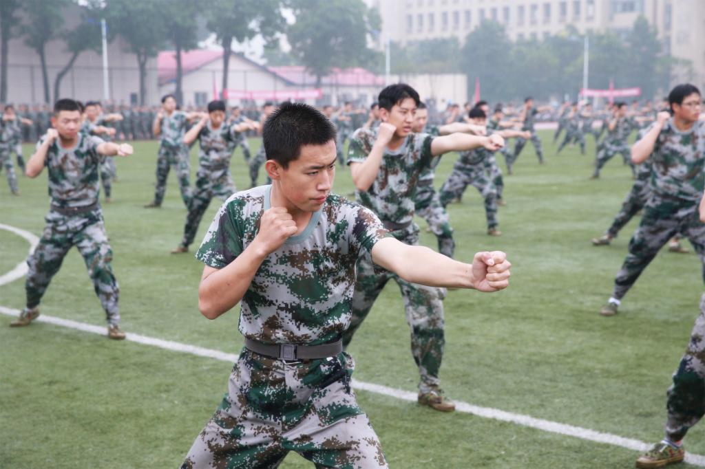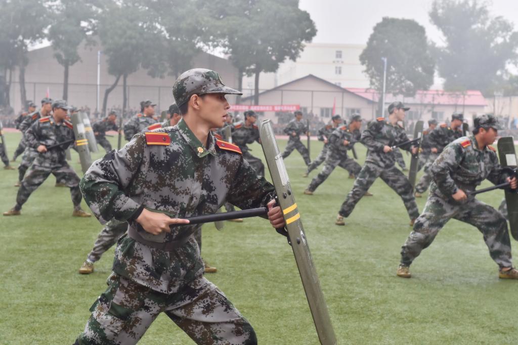 在激昂的国歌声中和飘扬的军旗下,7000名2018级新生列成多个方队,依次通过主席台,接受学院领导和军训教官的检阅。他们整齐的队列队形、矫健的步伐、标准的军姿、高昂的士气和奋发向上的精神风貌,赢得了领导和观众的阵阵掌声。阅兵式结束后,在教官们的统一指挥下,新生分别表演了军体拳、警棍盾牌术、反恐战术旗语操等单项科目,展示了十四天的军训成果。