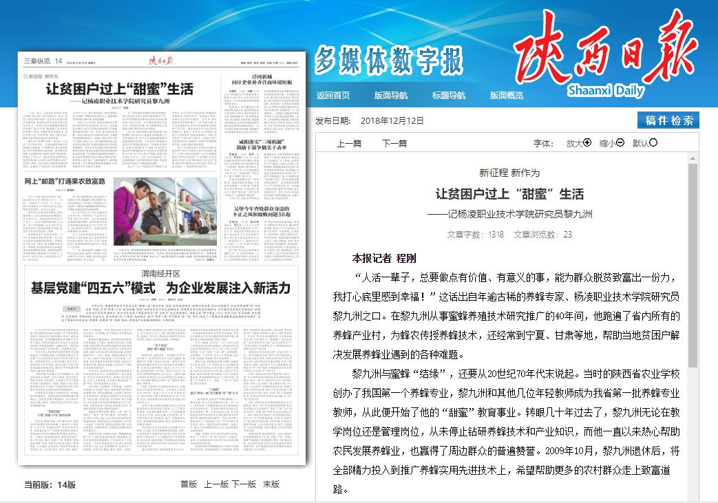 “人活一辈子,总要做点有价值、有意义的事,能为群众脱贫致富出一份力,我打心底里感到幸福!”这话出自年逾古稀的养蜂专家、杨凌职业技术学院研究员黎九洲之口。在黎九洲从事蜜蜂养殖技术研究推广的40年间,他跑遍了省内所有的养蜂产业村,为蜂农传授养蜂技术,还经常到宁夏、甘肃等地,帮助当地贫困户解决发展养蜂业遇到的各种难题。