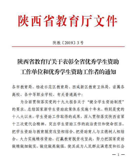 近日,我院2018年学生资助工作受到省教育厅通报表彰,被授予“全省优秀学生资助工作单位”称号。