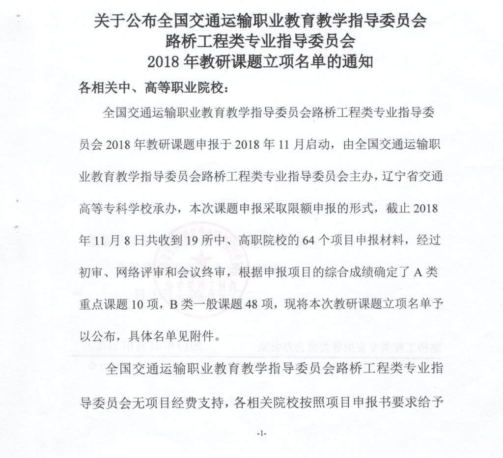 近日,全国交通运输职业教育教学指导委员会公布了路桥工程类专业指导委员会2018年教研课题立项名单。我院张朝晖副教授负责的《基于企业需求的高职道桥专业分类人才培养探索与实践》项目,入选2018年交通运输路桥工程类职业教育教研项目(重点课题A类)。