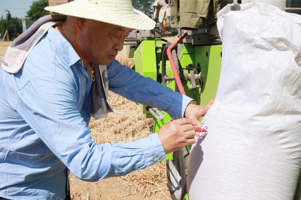 高温干旱天气为麦收作业提供了良好条件。金色的麦田被太阳晒得金灿灿的,成熟的麦穗颗粒饱满,丰收在望。育种是个精细活,育种试验地的收获环节更不得马虎。大家戴着草帽、手握镰刀来到麦田里,左手抓一把麦杆,右手握着镰刀迅速摸根割下,开始对不同麦系小麦品种进行收割。2013年初,在省农业农村厅的大力支持下,赵瑜小麦育种基地购置了进口小麦小区联合收割机,改变了长期以来育种试验收获全靠手工操作的状况。收割了一会后,大家参观了正在现场作业的收割机。看着色泽金黄、颗粒饱满的麦粒从卸仓口蹦跳进袋子里,大家都为赵瑜研究员感到高兴。