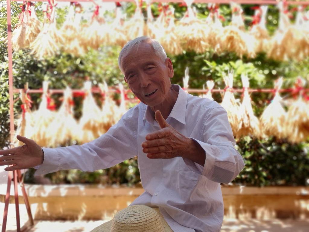 时至芒种节气,我国北方地区小麦正值收割季,育种基地门前广场上已经晾晒了一些麦子。刚一走进育种基地,大家便被挂在铁架上的一把把麦穗吸引,硕大而饱满的麦穗让大家赞不绝口。这是赵瑜研究员从各个小麦品种中精心筛选出的良种,用于育种研究或试验地的播种。在考种室前葡萄架下的阴凉处,大家席地而坐,聆听赵瑜研究员讲述自己六十年如一日,扎根豆村农场辛勤育种的故事。