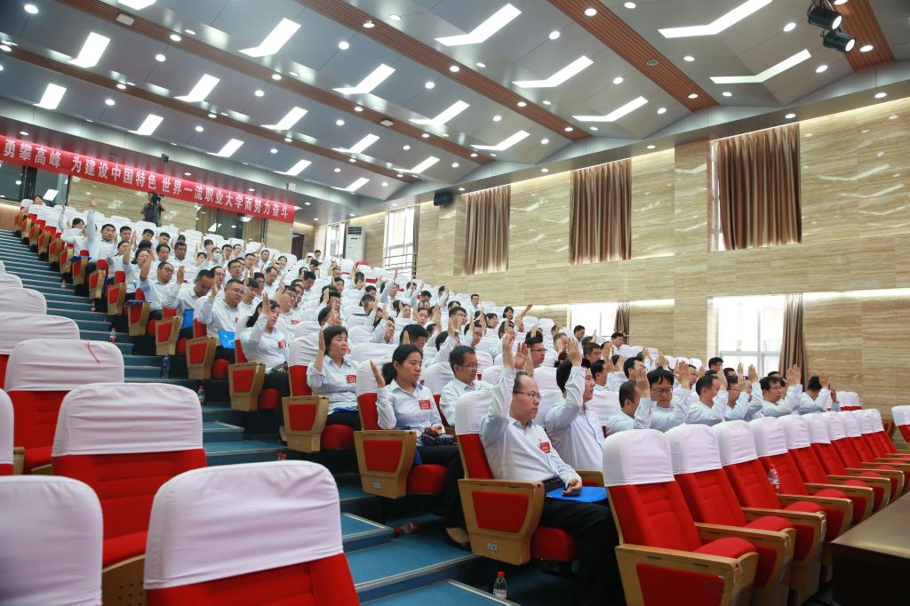 本次大会的主题是:高举中国特色社会主义伟大旗帜,以习近平新时代中国特色社会主义思想为指导,贯彻落实党的十九大及历次全会精神,以及习近平总书记系列重要讲话精神、对职业教育工作的重要指示精神,总结“十三五”,开局“十四五”,凝心聚力、勇攀高峰,为建设“中国特色、世界一流职业大学”而努力奋斗。