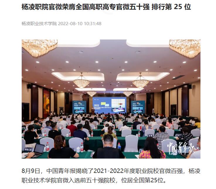 8月9日,中国青年报揭晓了2021-2022年度职业院校官微百强,杨凌职业技术学院官微入选前五十强院校,位居全国第25位。
