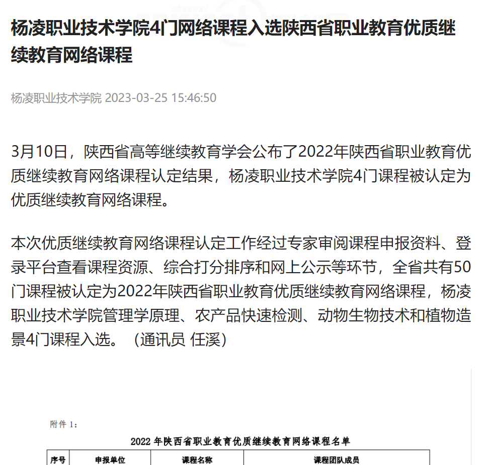 3月10日,陕西省高等继续教育学会公布了2022年陕西省职业教育优质继续教育网络课程认定结果,杨凌职业技术学院4门课程被认定为优质继续教育网络课程。