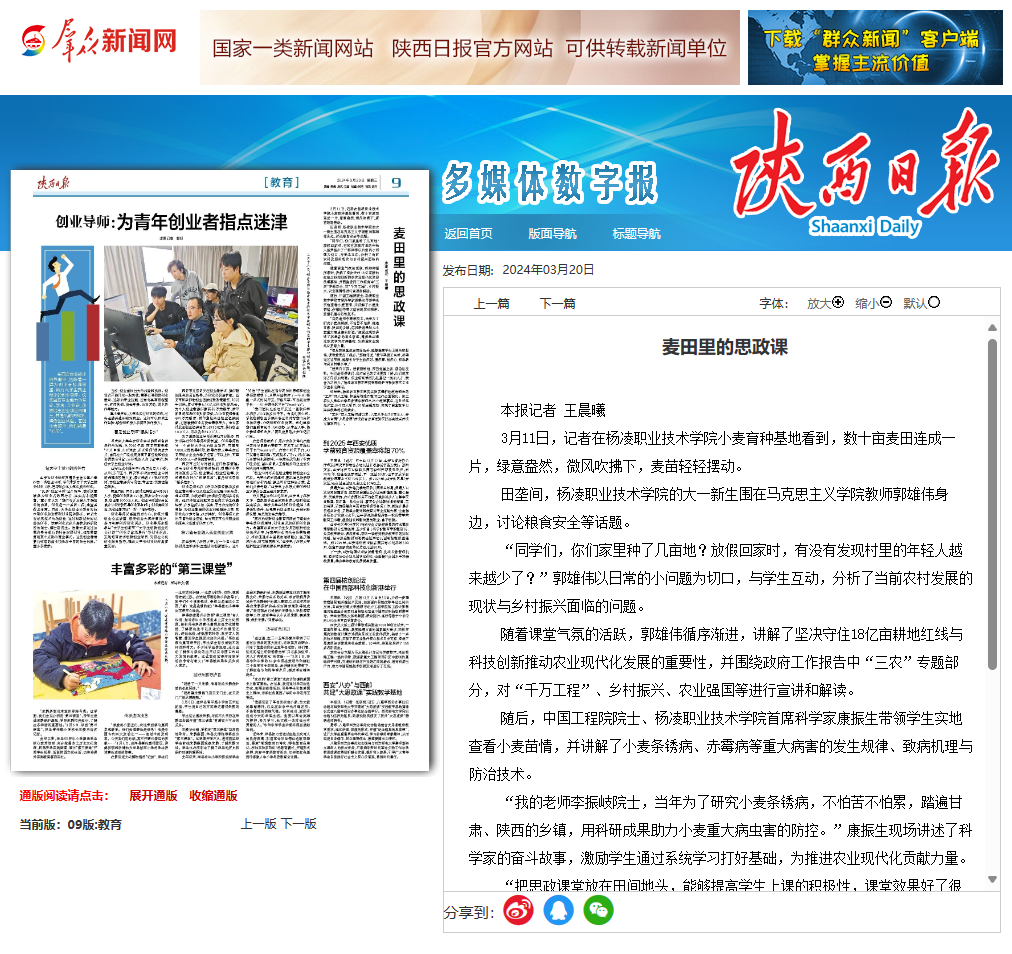 近年来,杨凌职业技术学院实施贯通耕读教育理念的“正禾”育人工程,推进思想政治教育工作全面深化。该工程从大学生必修思政课中梳理出25个教学要点,有针对性地设置10个育人项目、60项主题活动,实现了课堂教学与实践教学的有机结合。