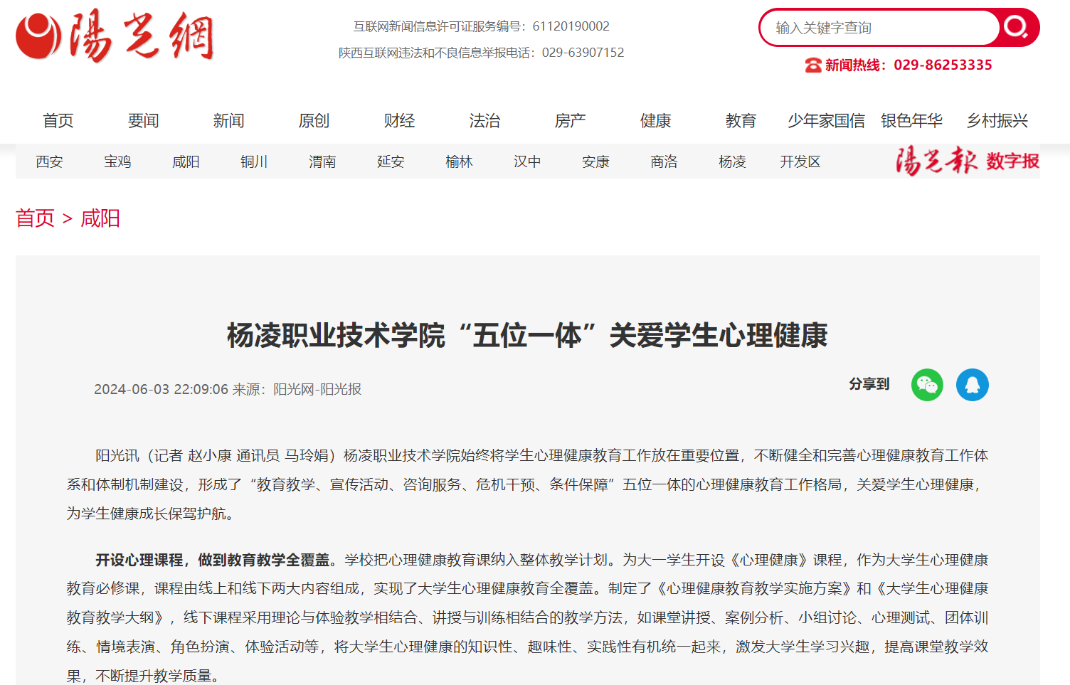 【阳光网】杨凌职业技术学院“五位一体”关爱学生心理健康