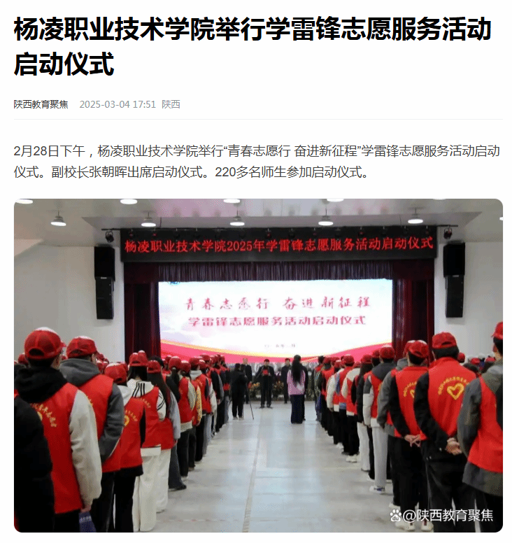 2月28日下午,杨凌职业技术学院举行“青春志愿行 奋进新征程”学雷锋志愿服务活动启动仪式。副校长张朝晖出席启动仪式。220多名师生参加启动仪式。
