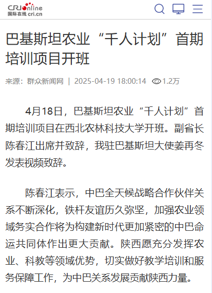 4月18日,巴基斯坦农业“千人计划”首期培训项目在西北农林科技大学开班。副省长陈春江出席并致辞,我驻巴基斯坦大使姜再冬发表视频致辞。