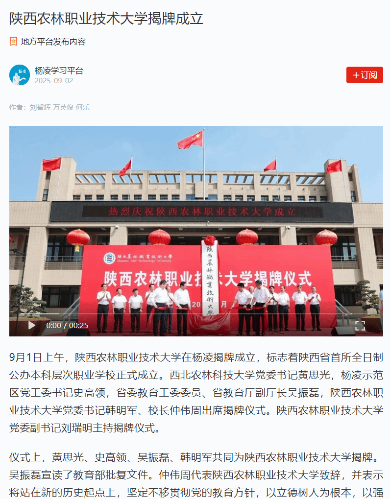 9月1日上午,陕西农林职业技术大学在杨凌揭牌成立,标志着陕西省首所全日制公办本科层次职业学校正式成立。西北农林科技大学党委书记黄思光,杨凌示范区党工委书记史高领,省委教育工委委员、省教育厅副厅长吴振磊,陕西农林职业技术大学党委书记韩明军、校长仲伟周出席揭牌仪式。陕西农林职业技术大学党委副书记刘瑞明主持揭牌仪式。