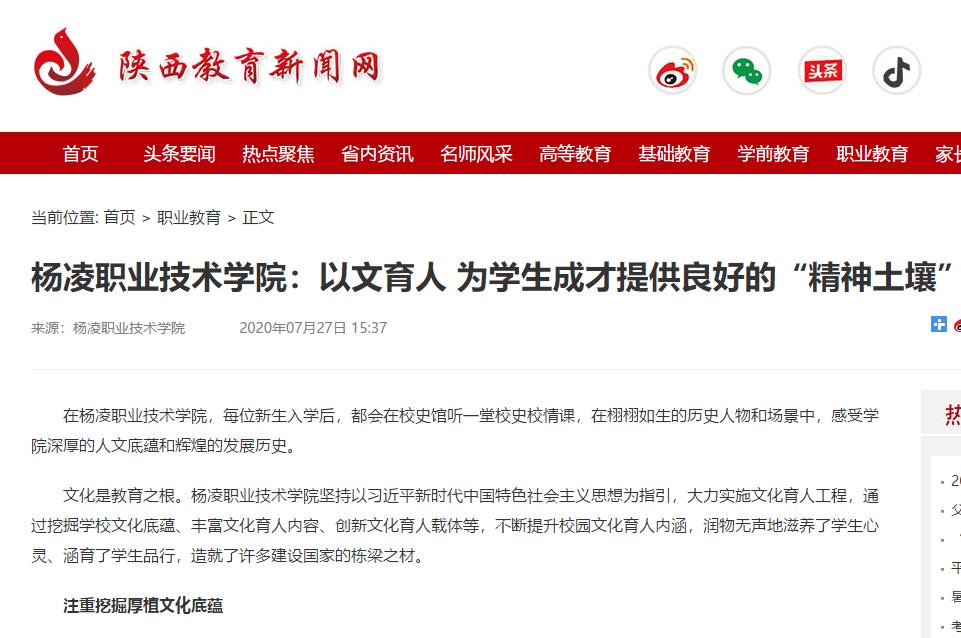 校园文化是一所学校精神风貌和办学特色的体现。近年来,杨凌职业技术学院常态化、制度化开展八大品牌育人工程,构建了全方位文化育人体系。实施“社会主义先进文化”教育工程,弘扬社会主义先进文化,坚定学生的四个自信和三个认同;实施“十大节庆”主题教育工程,遴选10个中华优秀传统节日,大力培育和践行社会主义核心价值观;实施“中华经典晨读”教育工程,用中华优秀经典文化教育培养、感染熏陶学生;实施“二十四节气暨农耕文化”教育工程,培养学生知农学农爱农情怀,彰显涉农院校育人特色;实施“学生社团百千万建设”工程,以学生社团为载体,开展思想政治教育、教育教学改革、团学管理、校园文化建设;实施“十大中华民族精神”教育工程,着力培育学生的民族精神和民族气节;实施“十大励志人物”励志教育工程,感召、感染、教育学生健康成长、励志成才;实施“双百励志”教育工程,着力培育学生红色基因。
