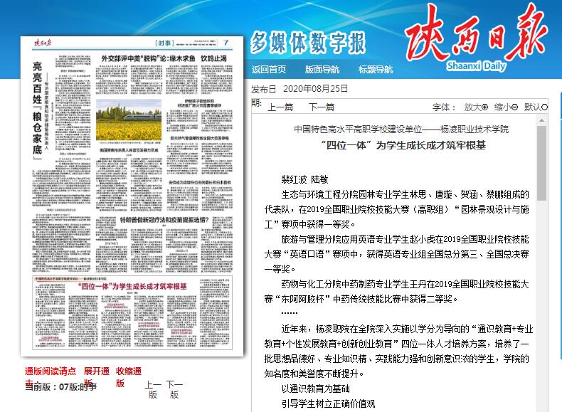 近年来,杨凌职院在全院深入实施以学分为导向的“通识教育+专业教育+个性发展教育+创新创业教育”四位一体人才培养方案,培养了一批思想品德好、专业知识精、实践能力强和创新意识浓的学生,学院的知名度和美誉度不断提升。