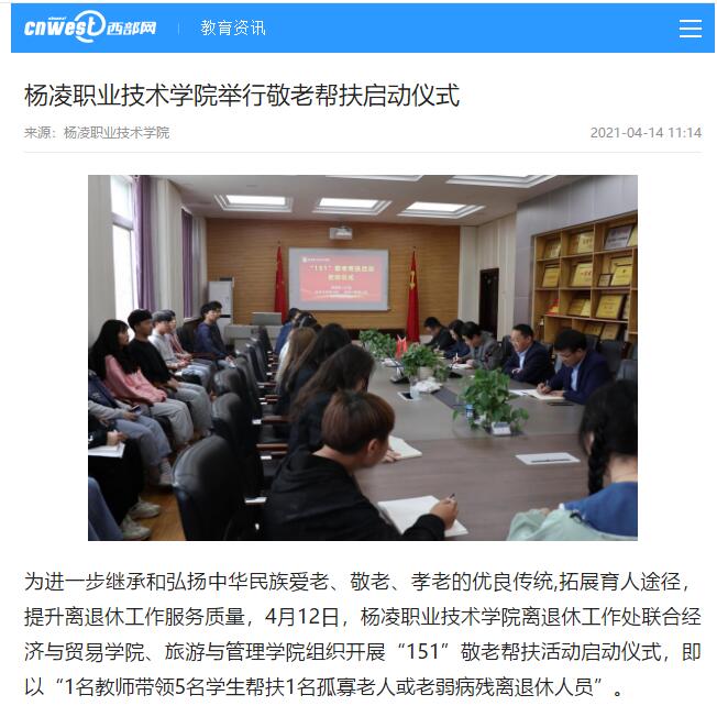 为进一步继承和弘扬中华民族爱老、敬老、孝老的优良传统,拓展育人途径,提升离退休工作服务质量,4月12日,杨凌职业技术学院离退休工作处联合经济与贸易学院、旅游与管理学院组织开展“151”敬老帮扶活动启动仪式,即以“1名教师带领5名学生帮扶1名孤寡老人或老弱病残离退休人员”。
