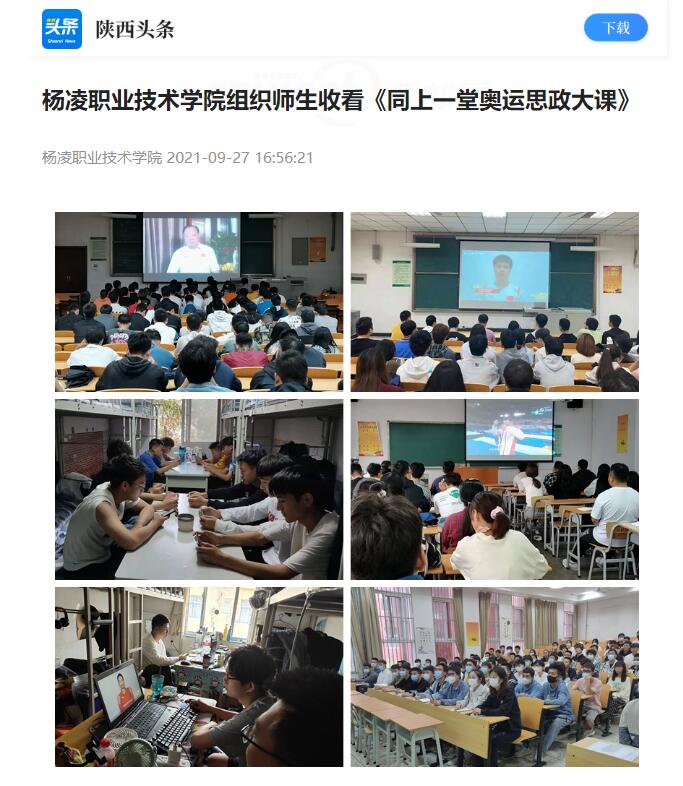 9月25日下午,全国大学生“同上一堂奥运思政大课”线上开播。杨凌职业技术学院组织全校师生利用手机、电脑、多媒体教室等方式,通过人民网+客户端、人民网微信公众号、咪咕视频客户端等平台齐聚直播间,共同观看奥运思政大课。