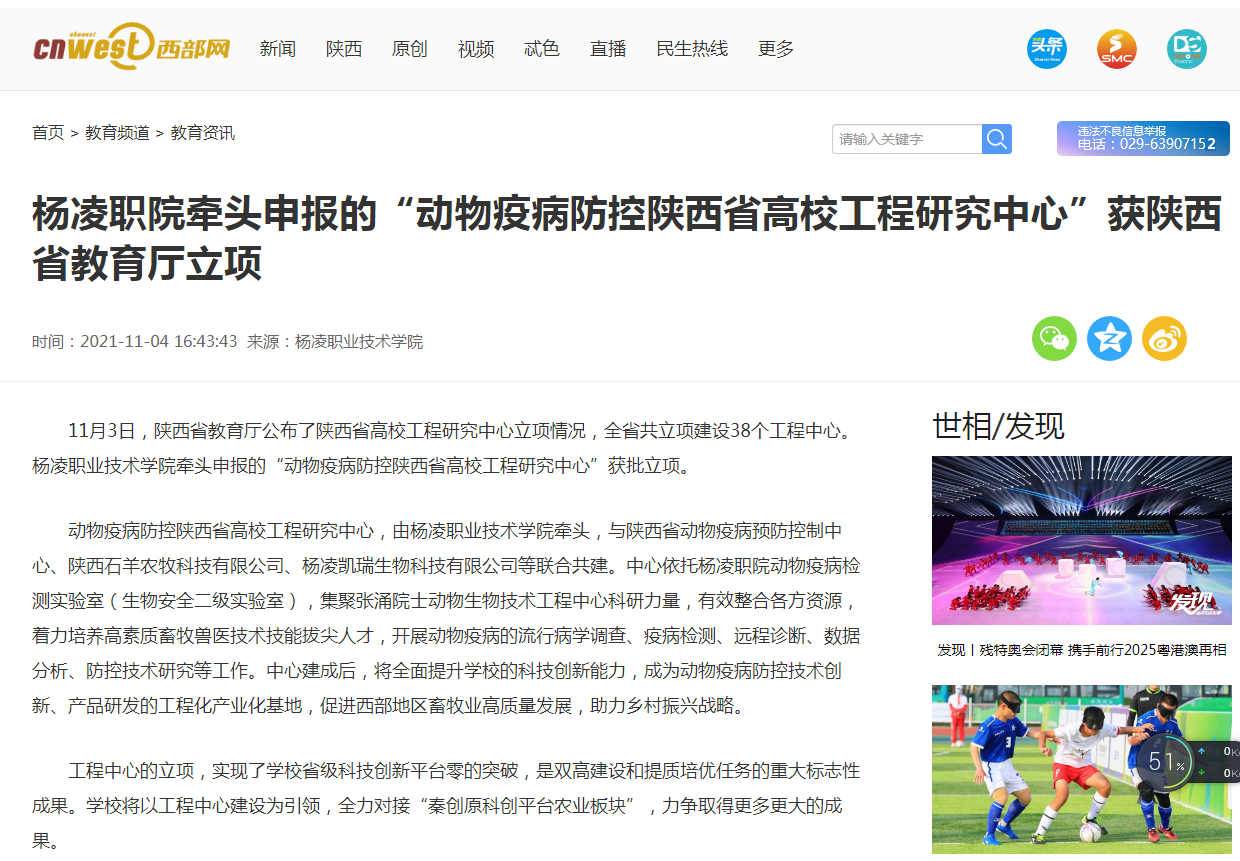 【西部网】杨凌职院牵头申报的“动物疫病防控陕西省高校工程研究中心”获陕西省教育厅立项