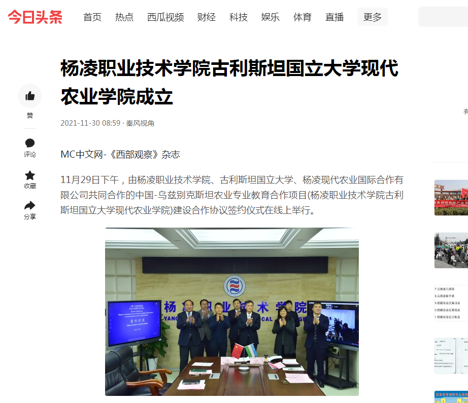 1129日下午,由杨凌职业技术学院、古利斯坦国立大学、杨凌现代农业国际合作有限公司共同合作的中国-乌兹别克斯坦农业专业教育合作项目(杨凌职业技术学院古利斯坦国立大学现代农业学院)建设合作协议签约仪式在线上举行。